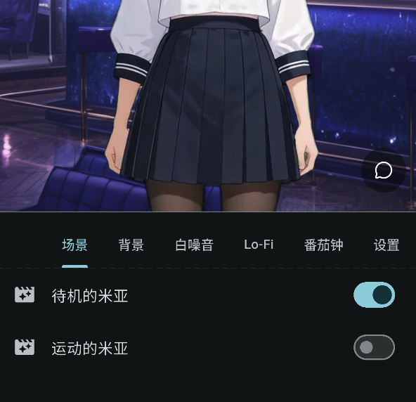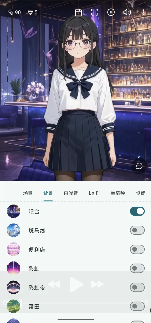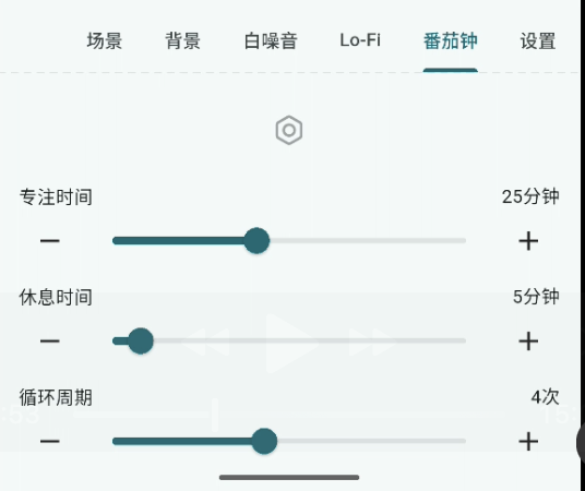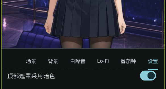 • 设置面板:用于选择场景/背景/白噪音/Lo-Fi/番茄钟/设置