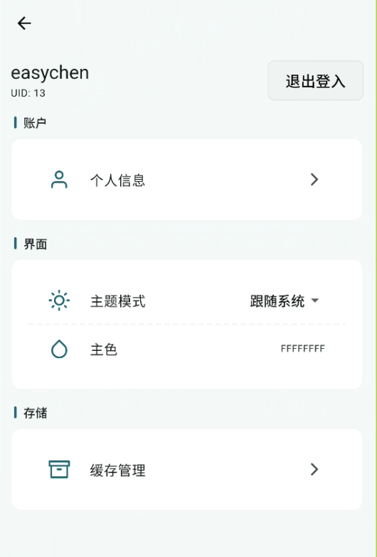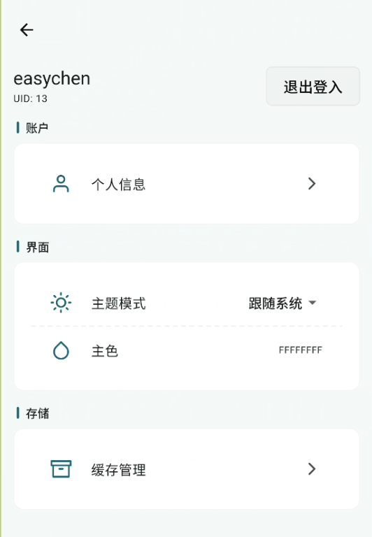• 设置:登录、个人信息、主题与主色、缓存管理等