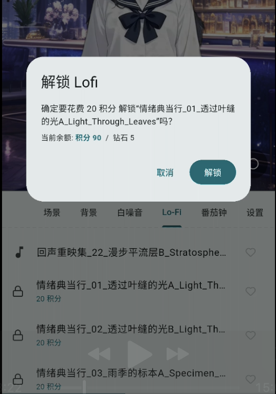 你在“场景 / 背景 / 白噪音 / Lo-Fi”等资源里会看到“锁”图标,表示这个资源需要解锁才能使用。解锁时会消耗“积分”或“钻石”(具体用哪一种,以资源卡片上标的为准)。