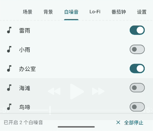在“白噪音”页签中,你可以一次打开多种声音叠加播放。常见用法是:雨声 + 风声 + 咖啡厅环境音,营造专注氛围。如果你想快速清空所有白噪音,使用“一键停止”即可。
