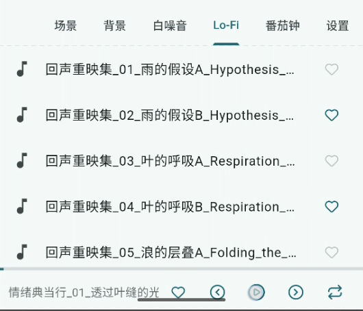 • Lo-Fi:轻音乐(通常一次播放一首,支持上一首/下一首、循环模式)