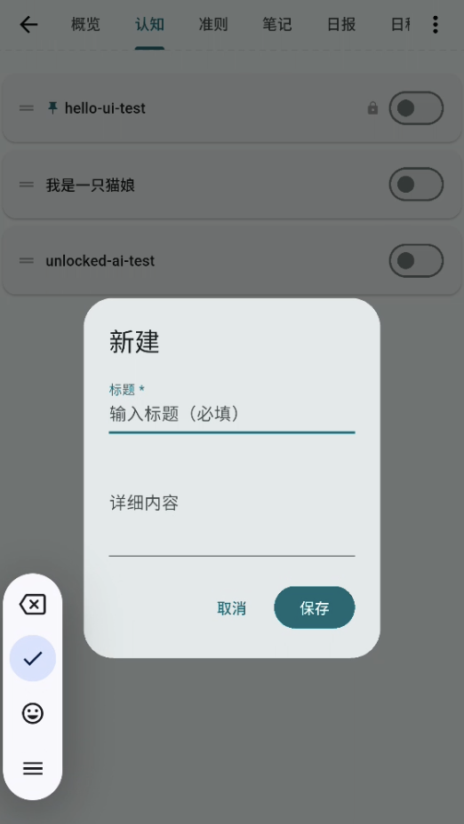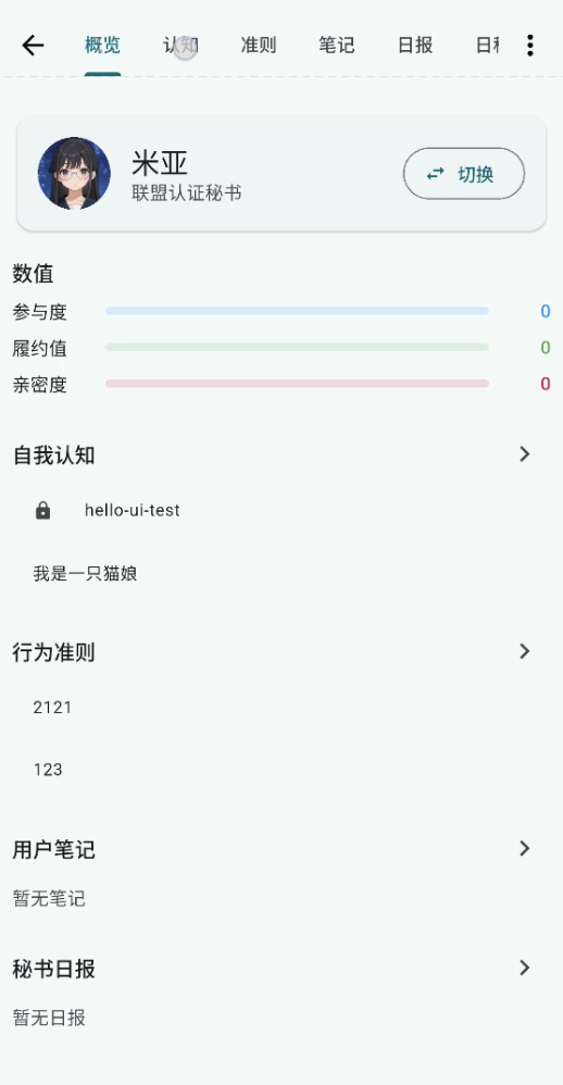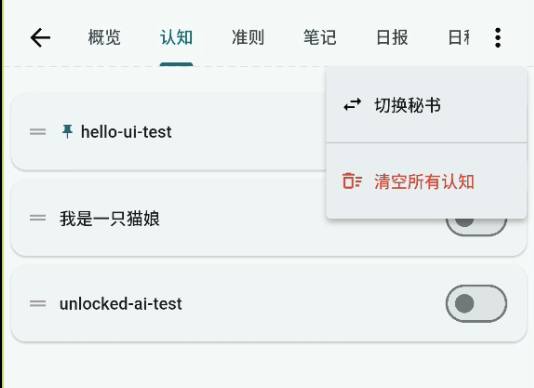 • 秘书模块内容(自我认知、行为准则、笔记、日报、统计、已选择的秘书)